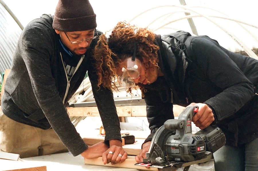 On a frigid and overcast Saturday morning before the storm, Kathleen McTigue, an IRC program manager; and Sheryll Durrant, New Roots farm coordinator, meet with my accompanying photographer and me. Though still recovering from a lighter storm that passed the previous day, the place is bustling with people and movement. McTigue informs us that they’re students partaking in the Farm School NYC certification program. Some are working inside the garden’s warm central greenhouse, others outside in the cold. The dedication is admirable as both groups power-saw wooden planks to be used for new gardening plots, ones to accompany the 16 educational and market beds along with 33 community garden beds that already exist on the half-acre site.